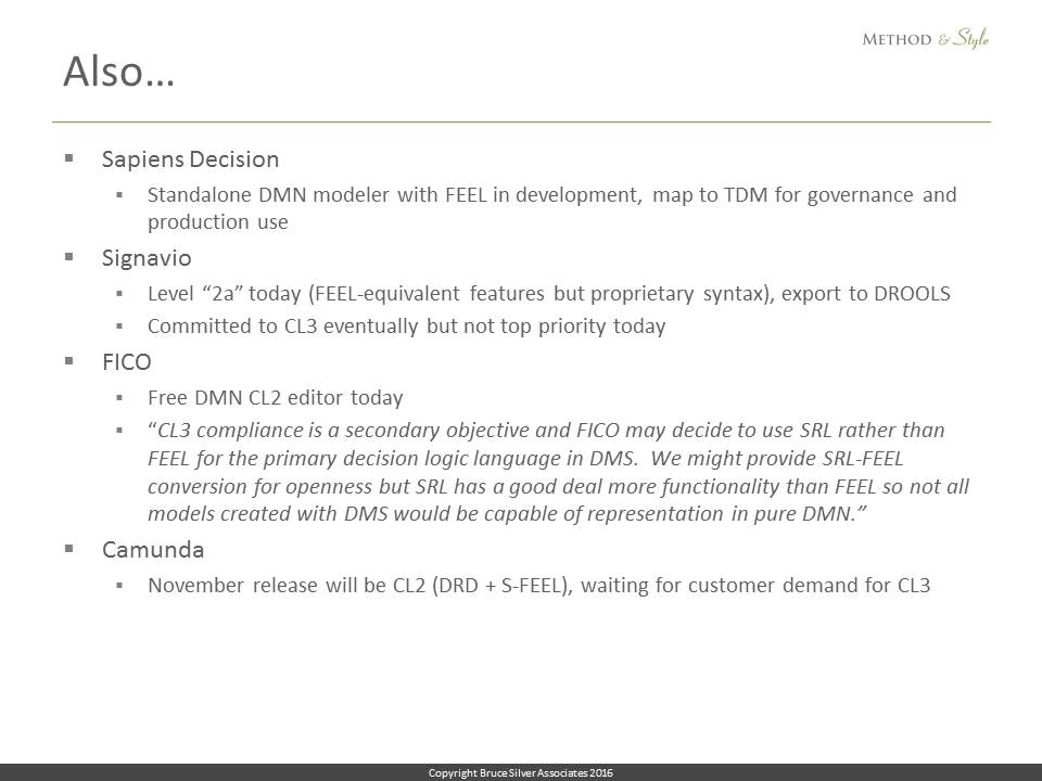 One reason why FEEL has not been readily adopted is parsing it is difficult, since variable names may contain spaces. Making FEEL easier to implement is a current topic in the DMN 1.2 task force, and there is inherent tension between ease of implementation and business-friendly syntax. (By the way, the business-friendly syntax side is winning.) In spite of this, we will see commercial FEEL implementations in 2016, which is good news, because FEEL implementation is critical to DMN’s long-term success.