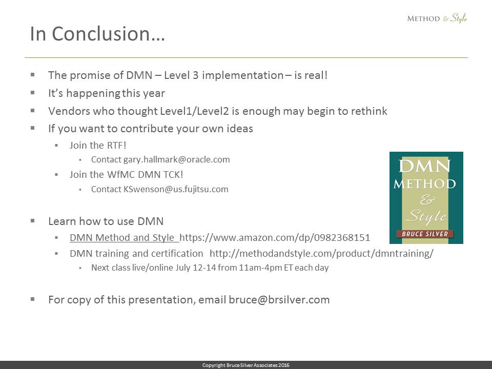 We’re still trying to make it better. If you want to participate, join the Revision Task Force in OMG. Contact Gary for that. Or Participate in the TCK – contact Keith Swenson for that. If you want to learn how to use DMN, here are links to my book and training – we have a live/online class next week!