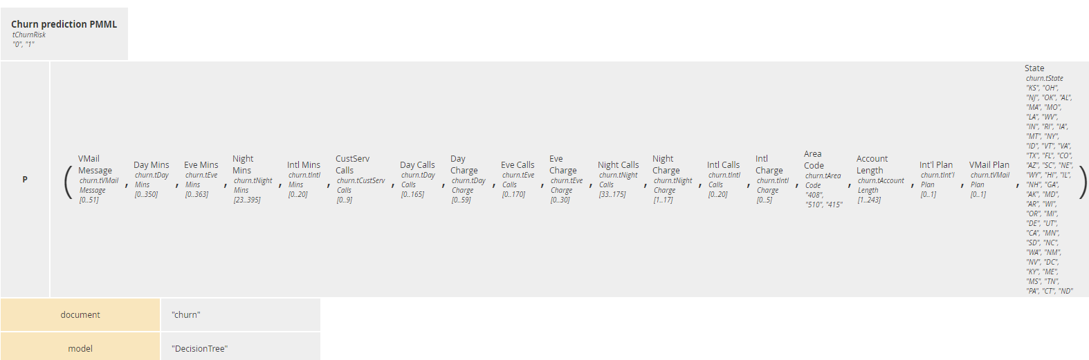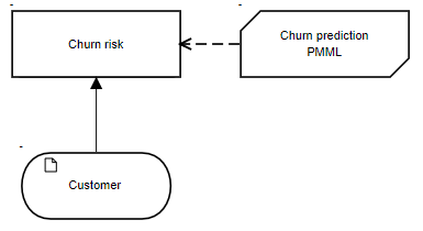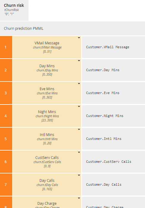 This model was saved as churn.pmml. Trisotech DMN Modeler is able to invoke PMML models and use the returned result within the decision logic. (Note: This requires the PMML subscription feature. Contact Trisotech for details.) As mentioned earlier, DMN functions – typically BKMs – by default use FEEL as their expression language, but the spec also allows them to be externally defined as either Java methods or PMML models. A PMML-based BKM is distinguished by the code P in the Kind cell of its boxed expression, displayed to the left of its list of parameters:The parameters of the BKM are the inputs (DataFields) specified in the PMML model. The PMML DataField denoted as “predicted” is the BKM output.
