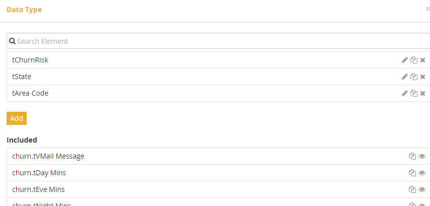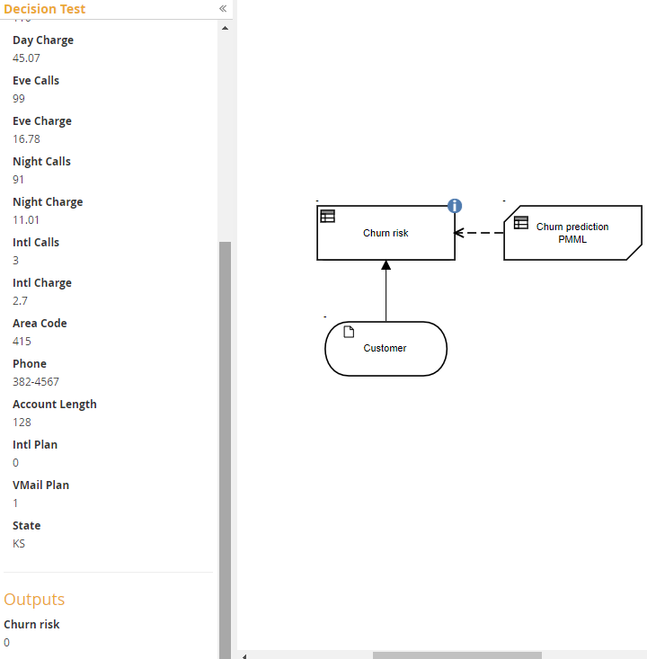 PMML has its own type system, which is slightly different from FEEL, but on PMML import Trisotech automatically creates a corresponding FEEL type for each input (PMML DataField) that is not a simple base type. The created types are namespace-prefixed, as mentioned. You need to convert them to non-imported types, but this is simply done by clicking the copy/paste icon for each one. In this model most inputs are numbers, but because Knime reports their minimum and maximum values in the dataset, Trisotech creates item definitions for them with these constraints. Actually, we'd rather not have these constraints, as it's possible a new test case could have an input value outside of the range or the original dataset. We can simplify the model by eliminating those item definitions in favor of the FEEL base type Number. The only ones we need to keep are the enumerations tAreaCode and tState.Finally we need to add the structure tCustomer describing our input data element, with one component per input DataField in the PMML, and assign it to input data Customer: