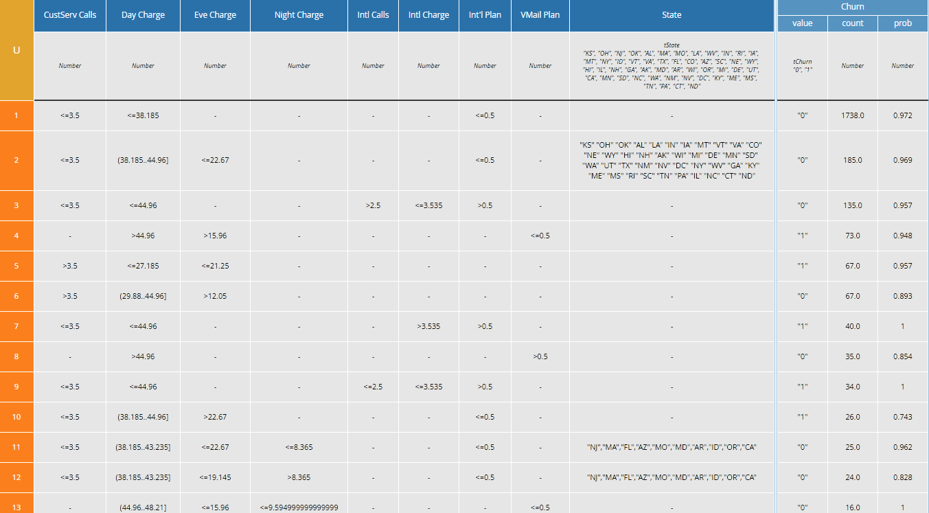 We can examine this table to try to understand the reasons why a Customer will churn. From rule 4 above, a high Day Charge and Night Charge looks like one factor. From rule 5 and others, we see that a high number of Customer Service Calls is another factor. From rule 7, a high International Charge looks like a factor, and from rule 9 an International Call Plan but low International Charge looks like another factor. On the other side, it looks like Customers with a Voice Mail plan are not likely to churn. All of these make some sense intuitively.