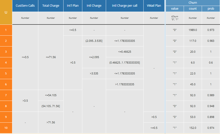 My takeaway from looking at this table was that perhaps we should consider the sum of Day, Evening, and Night Charges as an additional "refined" input, also the average cost per International call. State doesn't make a lot of sense to me, so let's get rid of that one. I went back to the Customer attribute spreadsheet, eliminated the unused inputs (plus State) and added the refined inputs Total Charge and International Charge per call. Then I created a new decision tree with Knime using the revised spreadsheet and converted that to a decision table, just to see if it made any difference.It did. Not only is the new model more accurate...