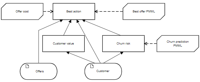 The input data are Customer, with attributes taken from billing records, and Offers that could be extended in order to retain the Customer. The DMN decision Churn risk executes the machine learning model Churn prediction PMML, returning a Boolean value. If Churn risk is true, the decision Best action invokes a second machine learning model Best offer PMML that suggests the Offers likeliest to be attractive to this Customer. Supporting decision Customer value computes a value metric for retaining this Customer and for each Offer, the BKM Offer cost computes its cost. Based on these inputs, Best action selects an Offer, its decision logic explainable even if the logic of Churn prediction PMML and Best offer PMML is not.