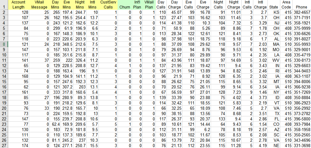 The goal of any machine learning model is maximum prediction accuracy, but what does that really mean? Like many decision models, the outcome of this one is binary, either churn or no-churn. If we call churn "positive" and no-churn "negative" and we call the prediction true if the predicted value matches the actual value, we have the following possible outcomes for each prediction: true positive (TP), true negative (TN), false positive (FP), and false negative (FN).The metric accuracy is defined as (TP + TN)/(TP + FP + TN + FN), but this is not necessarily the most important measure when the examples are highly skewed, meaning many more negatives than positives. Precision, defined as TP/(TP + FP), measures what fraction of predicted positives are actual positives. Recall, defined as TP/(TP + FN), measures what fraction of actual positives are predicted. The metric you are trying to optimize - or perhaps some combination of these - depends on the circumstances of the decision. The four numbers TP, TN, FP, and FN, comprising the model's confusion matrix, are provided by the tool used to create the model.