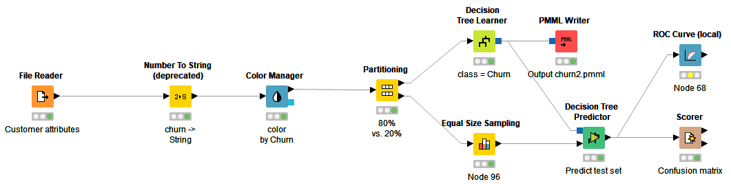 For this scenario, the machine learning model was created using a free open source tool called Knime. Most machine learning models are created by programmers in Python or R, but Knime is nice for non-programmers because models can be created simply by assembling graphical widgets in a workflow.Here the File Reader node ingests the Excel file of Customer attributes. The Partitioning node randomly splits the examples into a training set (80%) and test set (20%). This is important for any type of machine learning model but especially important for decision trees, which are prone to "overfitting". Overfitting gives high accuracy on the training set but degraded accuracy on untrained examples. For this reason, you train the model on the training set examples but measure accuracy on a separate test set, called cross-validation. The Equal Size Sampling node ensures that the test set has an equal number of churn and no-churn examples. The Decision Tree Learner node trains the decision tree. This is passed to the Decision Tree Predictor node, which applies it to the test set examples. The Scorer node reports the confusion matrix for the test set. The PMML Writer node creates a PMML file for the model.