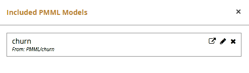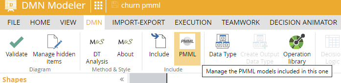 Then click the icon again and Add the PMML model to your DMN model. Adding a PMML file works like the Include button for normal DMN import. The PMML is imported in its own namespace, which is referenced as a prefix to the names of any imported variables and types. Trisotech DMN defaults the prefix to the name of the imported model - in the figure below it is churn - but using the pencil you can edit it to something else if you like.