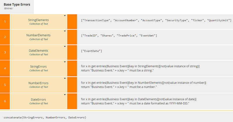 for x in get entries(Event)[key in String Elements][not(x.value instance of string)] return "Event component " + x.key + " must be a string."To check for datatype errors beyond base type conformance, more often you will use a Collect decision table with a Boolean test of the type in the input entry. Each rule returns an error message if its input entry evaluates to true. But you need to be careful that this input entry itself does not give a runtime error. For example, the following Boolean test of the component Event.comp1, which is expected to be a non-empty string, is incorrect: