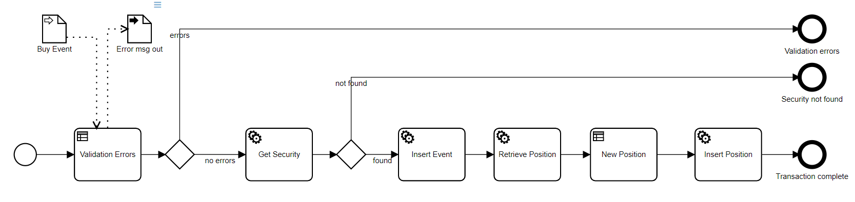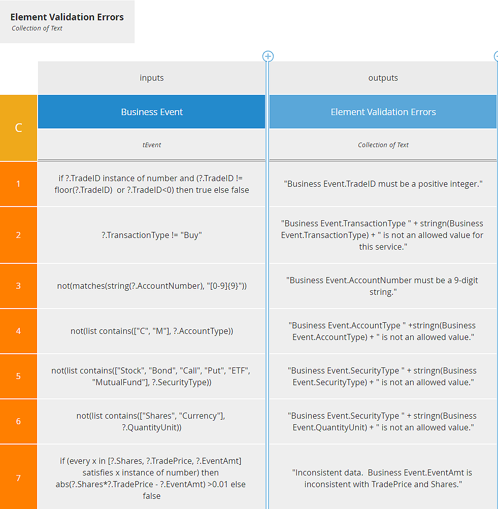 Even though all these validation tests seem like a bit of work - and they are - the goal is to avoid runtime errors, especially "Bad Request", which - trust me - is usually a larger bit of work to find and fix. With that in mind, let's take a look at a simple example.We're building a Stock Trading app that receives various types of Business Event (Buy, Sell, etc.) and updates a variety of tables as a result. All types of Business Event share the same item definition tEvent, but each type triggers a different service that updates the tables in a particular way. The diagram above illustrates the service for a Buy Event. The main steps in the service involve logging the event, retrieving the position for that account and security, generating a new position record, and inserting it in the database. But to avoid runtime errors, first we need to validate Buy Event and make sure the security it references is one we support. We focus here on the decision task Validation Errors, which looks for errors in the data input Buy Event. It invokes the decision service, also called Validation Errors, created in DMN, which outputs a list of validation errors... ideally an empty list.