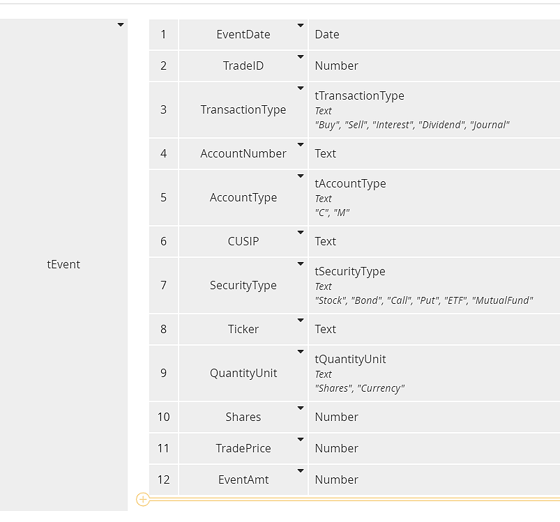 Buy Event is FEEL type tEvent, shown above. For this service, certain components are required, others optional. Some have allowed values enumerated by the item definition. The validation DMN model is shown below: