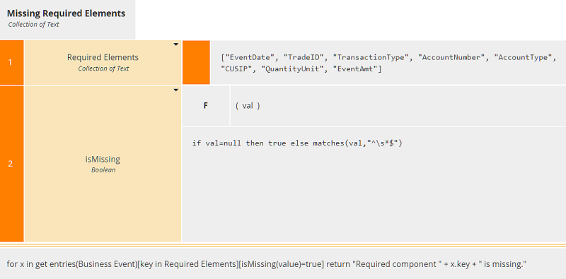 if val=null then true else matches(val,"^\s*$")The Boolean function matches() compares its first argument to a regular expression, here meaning zero or more whitespace characters, so isMissing() returns true if its argument is either null or whitespace. Ideally no components of the business event survive this double filter and the iteration returns an empty list, but if any member of Required Elements is missing, it generates an error message.