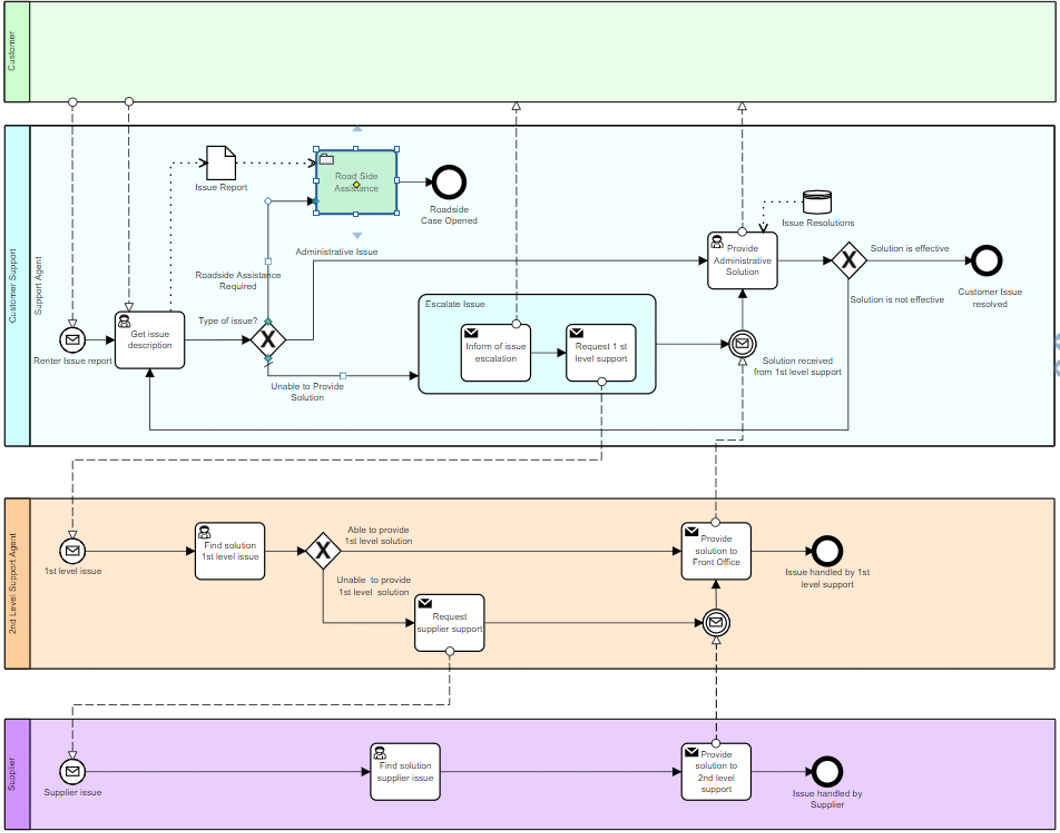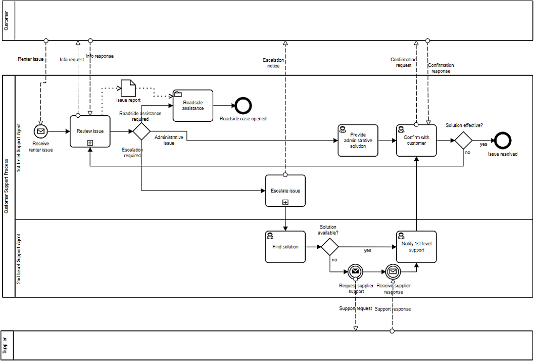 In this EU-Rent model, the pool labeled Customer Support and the pool labeled 2nd Level Support Agent should be lanes within a single process pool, not separate pools. Also, the pool Supplier should be black-box. The Customer Support provider doesn’t really know what the Supplier’s process is. He just knows the message flow interaction with the Supplier. As you will see, there is no significant information lost in making Supplier a black-box pool.