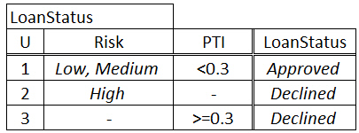 If Risk="Low" or "Medium" and PTI<0.3 then "Approved" else "Declined"Here it is in Excel formula syntax: