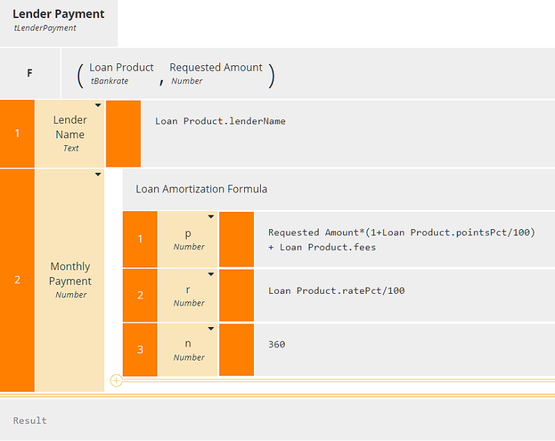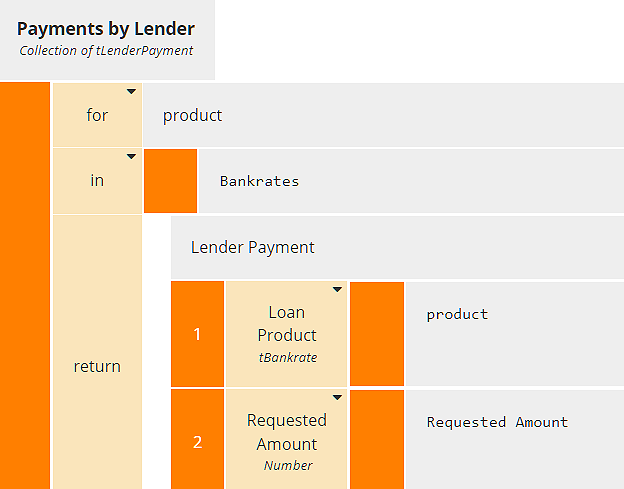 For example, suppose we want to process the Bankrates table above and create a new table Payments by Lender with columns Lender Name and Monthly Payment, using a requested loan amount of $400,000. And suppose we have a BKM Lender Payment, with parameters Loan Product and Requested Amount, that creates one row of the new table, a structure with components Lender Name and Monthly Payment. We will iterate a call to this BKM over the rows of Bankrates using the for..in..return operator. Each iteration will create one row of Payments by Lender, so at the end we will have a complete table.