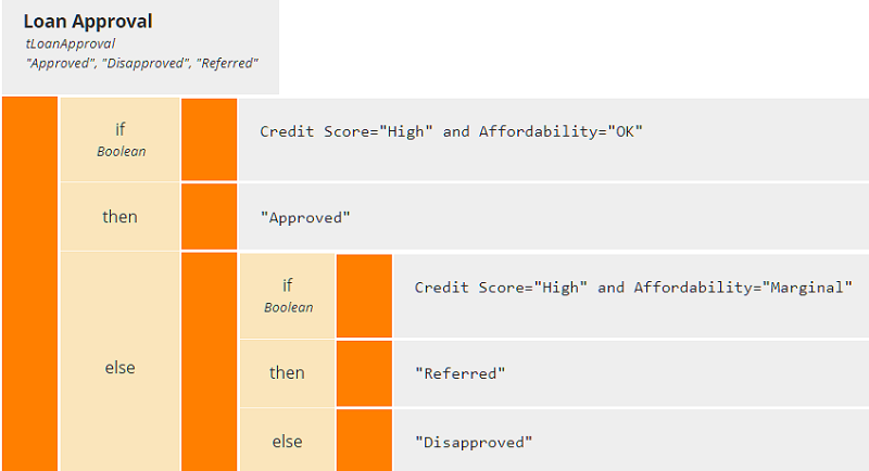 IF(AND(Credit Score = "High", Affordability= "OK"), "Approved", IF(AND(Credit Score = "High", Affordability = "Marginal"), "Referred", "Disapproved"))Even though the FEEL syntax is fairly straightforward, DMN includes a conditional boxed expression that enters the if, then, and else expressions in separate cells, in theory making the operator friendlier for some users and less like code. Using that boxed expression, the logic above looks like this:
