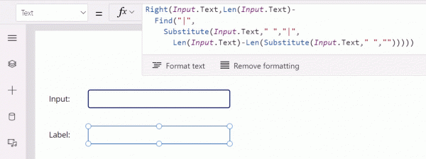 The formula in cell A2 displays the text following the last space in cell A1, and it does this live as you type in cell A1. Take a look at the Power Apps version (click image to animate):