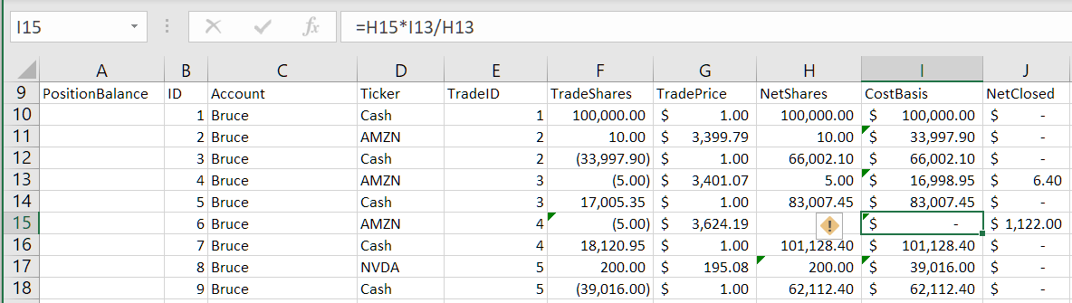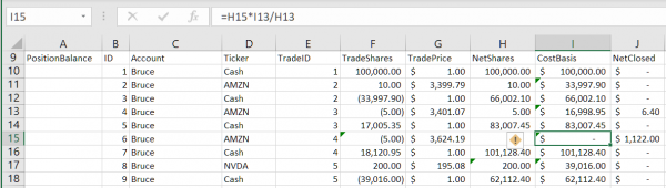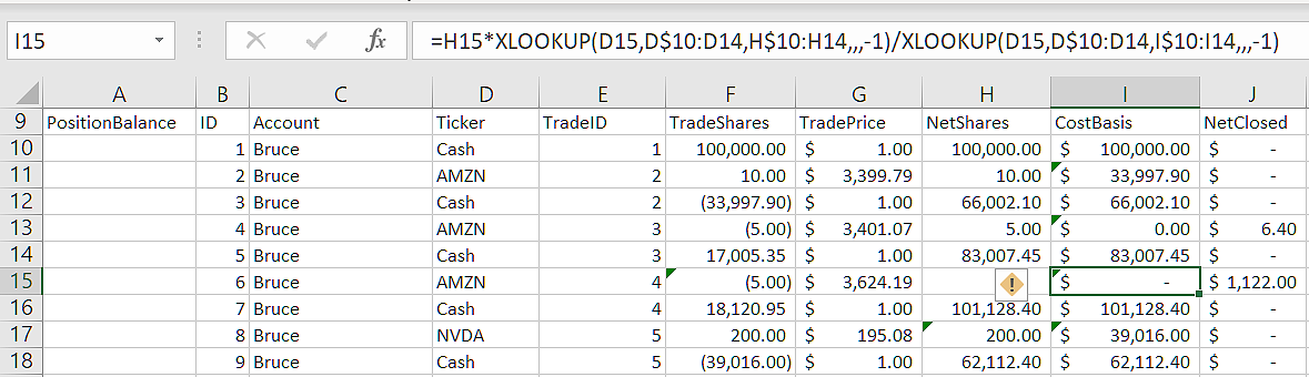 And remember, we need a different CostBasis formula depending on Cash or non-Cash, and Buy or Sell trade. In Excel formulas, you would need to wrap all that XLOOKUP business inside IF functions: