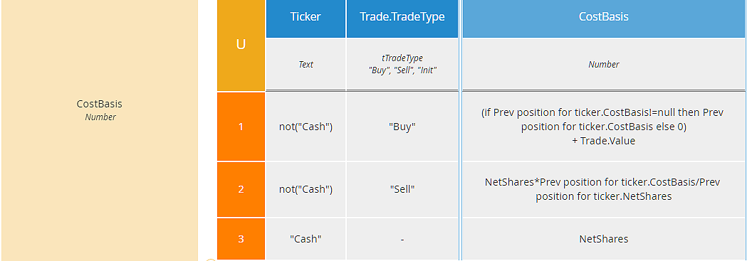 Here we have a decision table inside a context, where each context entry models a column of PositionBalance. The only complexity here is accounting for the possibility that there is no previous PositionBalance record for the ticker, and even that is a simple if..then..else.