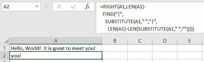 LEN(A1)-LEN(SUBSTITUTE(A1," ","")) – Count of spaces in the original string