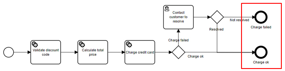 While constraints like these might seem overly restrictive at first, in practice it turns out they are not. Their value is that they allow the consumer of your BPMN models to trace the logic from parent level diagram (with gateways) to child level diagram (with end states) in a simple mechanical way, by matching the text labels. Here is an example. In the top-level process diagram below, Collect payment is followed by a gateway with gates Charge ok and Charge failed. Method and Style says that means that Collect payment has two end states - two different ways it could end - called Charge ok and Charge failed.
