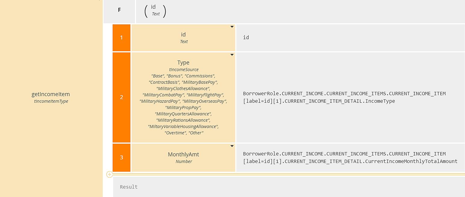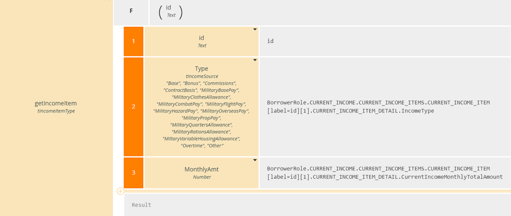 We also need to define a function - a context entry that acts like a BKM - that returns a row of the income item table, including the income type and amount, given its id. This is a context with no final result box, one context entry per column of the table: