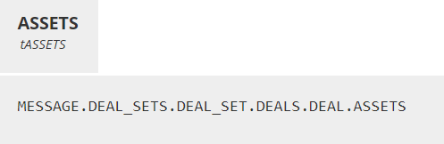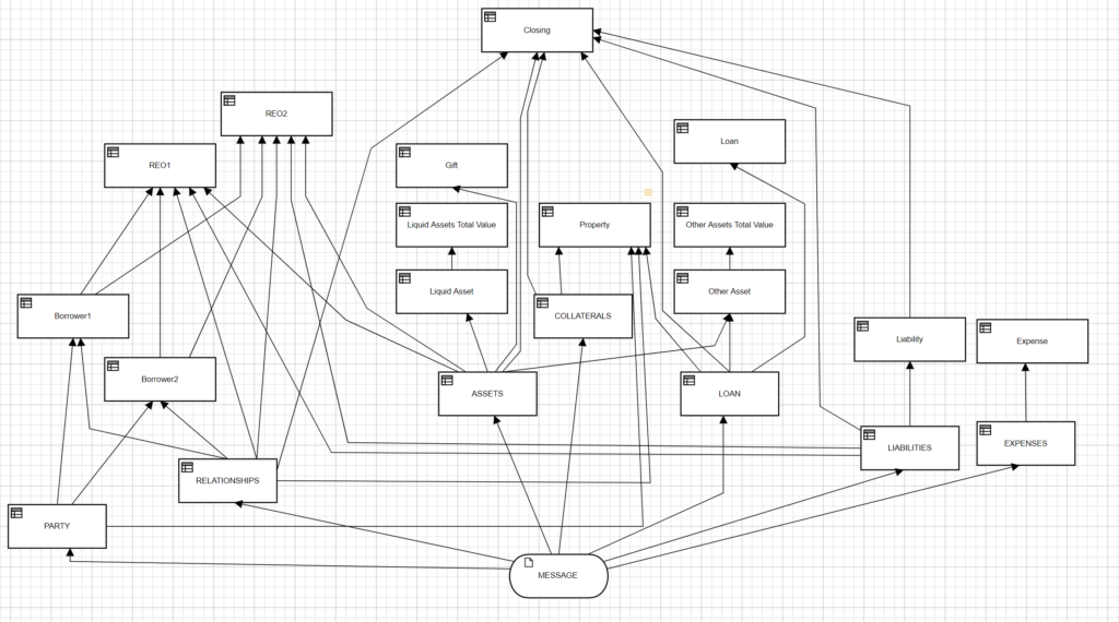 The decisions labeled in all caps connected to the input data MESSAGE are the MISMO container elements selected from the Accelerator. They simply drill down from the MISMO root to the selected container. For example, ASSETS is shown here: