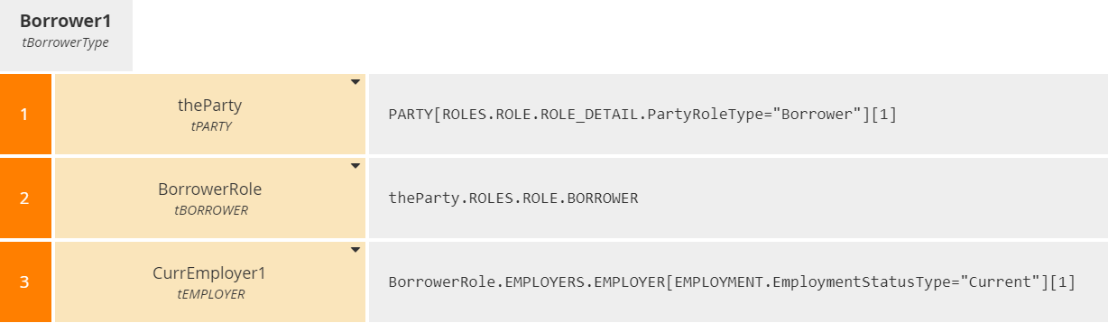 theParty selects the MISMO PARTY element representing Borrower1. BorrowerRole selects that PARTY's BORROWER container. CurrEmployer1 selects the first EMPLOYER of that BorrowerRole with a status of "Current". You get the idea... it's a lot of filter expressions.