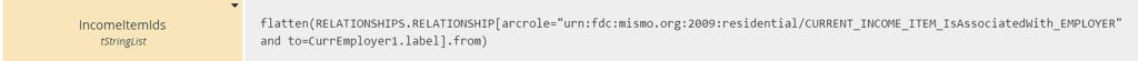 To get the Borrower's current income, itemized by type (Base, Bonus, etc.), we need to create a join using MISMO's RELATIONSHIPS element. The join returns a list of income item ids for the Borrower's current employer: