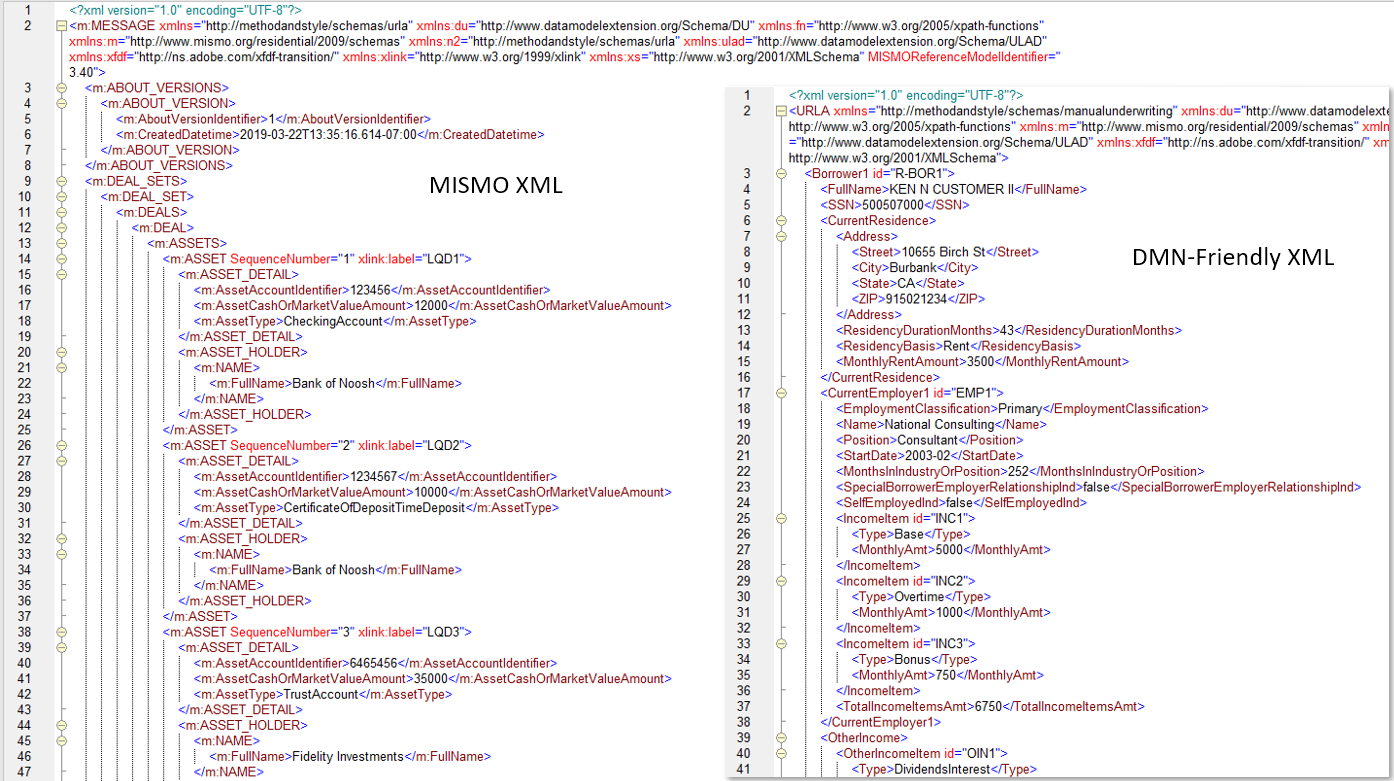 In a recent post, I showed how DMN could be used to model and execute decision logic on complex XML input data such as loan application information in MISMO format. The MISMO schema was envisioned as an enterprise data dictionary for the mortgage industry, standardizing the names of various information elements for use across any mortgage-related application. As such, however, it is effectively impossible to use MISMO data directly in decision models. For one thing, the elements needed for a particular decision begin five or six levels down from the root and tend to be strewn across a variety of containers. For another, concepts fundamental to a particular mortgage area, such as Borrower, are not in the schema at all. In MISMO, a Borrower is a PARTY with attribute PartyRoleType of "Borrower". And something as basic as the Borrower's current income requires a complex join of income items to an Employer of the Borrower. Still, it's just a data mapping problem.