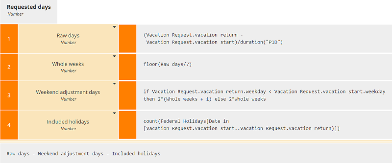 Raw Days = (Vacation Request.vacation return - Vacation Request.vacation start)/duration("P1D")