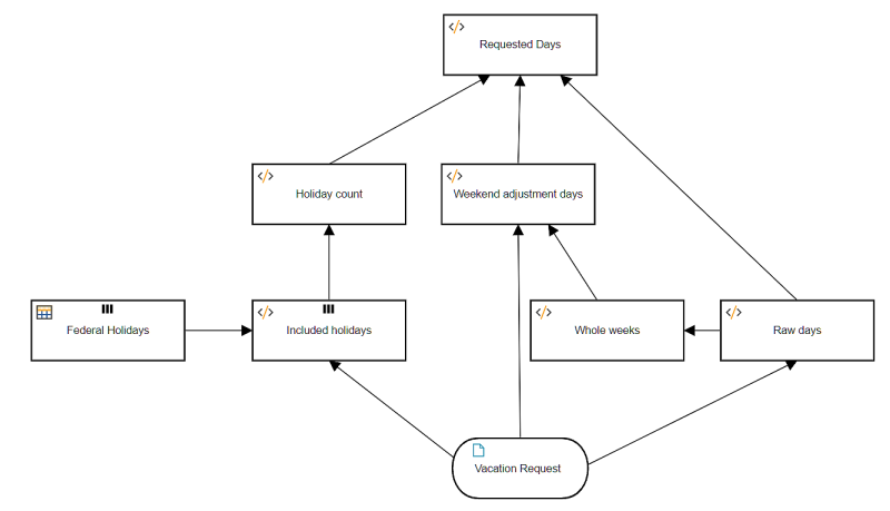 Now we have 4 context entries, each defining a variable local to the decision. The logic of each one is as we derived previously. If I showed this to you at the beginning of the post, your eyes would have glazed over. It looks complicated when you haven't gone through the logic. But now you've already seen each piece of it. All we're doing is contracting that DRD with 7 decisions to something equivalent but much simpler. Note that in a context, each value expression can reference both the decision input Vacation Request and any preceding context entry. So, for example, Whole weeks references the prior entry Raw days. The final result box at the bottom here references only context entries, simplifying the expression.