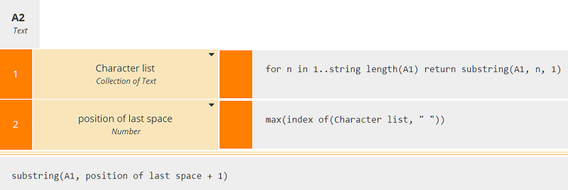 The FEEL is obviously simpler because of the built-in split() function, which tokenizes the string into a list of words, and the filter operator [-1], which selects the last item in that list. Power FX has neither of those features. But let's imagine FEEL did not have them either, and use FEEL equivalent to Microsoft's logic, which is based on finding the character position of the last space in A1. Microsoft's expression is virtually impenetrable, but it works as follows: