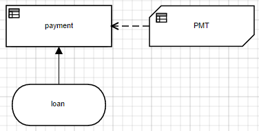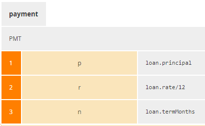 Even though your decision models might use that formula frequently, it's a lot to remember. So you could define a parameterized version of it in a business knowledge model, or BKM, and reuse it by invoking it from various decisions. The DRD here shows invocation of the BKM PMT. The boxed expression for PMT, with parameters p, r, and n, is shown next. The boxed expression for the invocation of PMT is last, mapping the inputs of payment to the parameters of PMT.