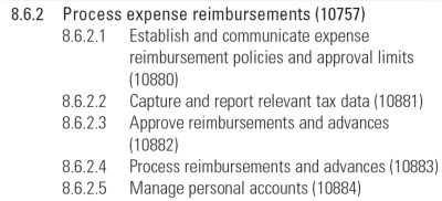 Take, for example, the Process Classification Framework of APQC, a well-known BPM Architecture organization. It is a catalog of processes and process activities commonly found in organizations. But these frequently are not what BPMN would call processes. Even those that qualify as BPMN processes may contain activities that are not performed repeatedly on instances or whose instances are not aligned with the process instance. Here is one called Process Expense Reimbursements, listing five activities.