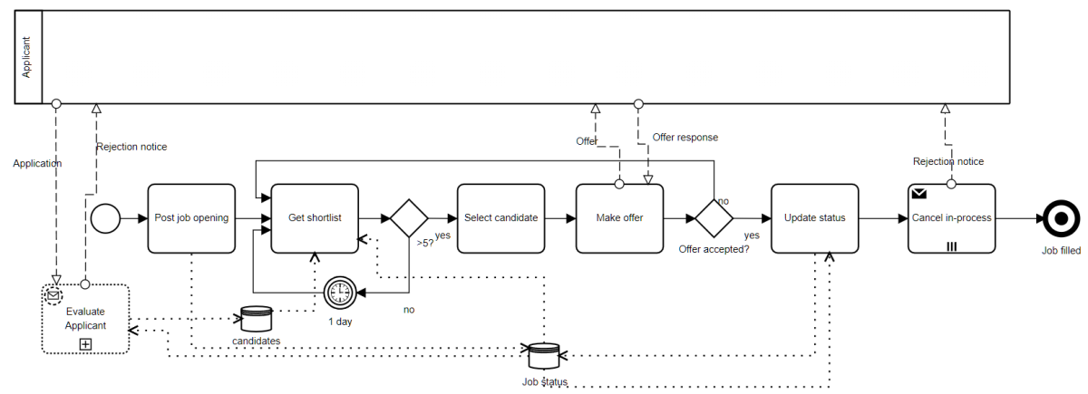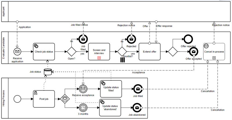 Here there is one instance of Hiring Process for N instances of Evaluate Candidate, so the latter has the multi-participant marker. Hiring Process starts manually when the job is posted and ends when either the job is filled or the posting expires unfilled after three months. Each instance of Evaluate Candidate starts when the application is received, and there are various ways it could end. It could end right at the start if the job is already filled, since before the instance is routed to any person, the process checks a datastore for the current status of the job opening. It could end after Screen and interview if the candidate is rejected. If an offer is extended, it could end if the candidate rejects the offer, or successfully if the offer is accepted. And there is one more way: Each running instance could be terminated in a Message event subprocess upon receiving notice from Hiring Process that the posting is either filled or canceled. While not perfect, this BPMN model illustrates instance alignment between multiple processes working in concert, including how information is communicated between them via messages and shared data.