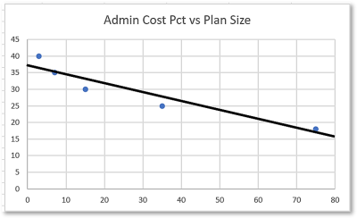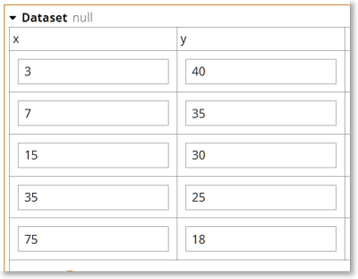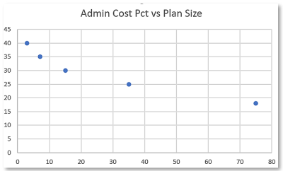 Consider the table Dataset, a list of x-y pairs. Here x represents the number of members in a group health insurance plan, and y represents the administrative cost of the plan as a percentage of claim value. We would expect the admin cost percentage to decrease as the number of members increases, which is what we see when we graph the table.