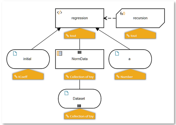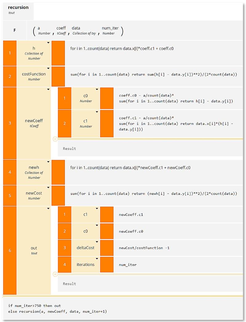 c1 := c1 – a/n*sum(for i in 1..n return x[i]*(h[i] – y[i]) To do this in DMN requires recursion, a function that calls itself with new arguments each time. Each iteration generates new values for c0 and c1, from which we calculate cost, and we iterate until cost converges on a minimum.