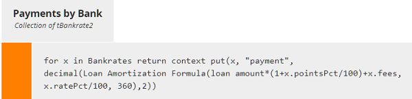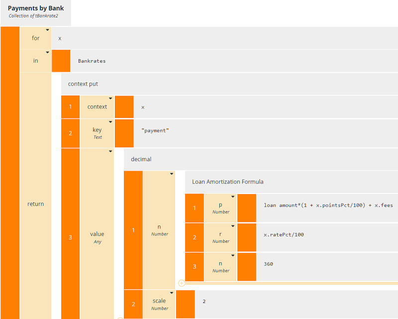 context put(), with parameters context, keys, and value, appends components (named by keys) to a an existing structure (context), and assigns their value. If keys includes an existing component of context, value overwrites the previous value. Here keys is the new column name "payment", and value is calculated using the BKM Loan Amortization Formula. So, as a single literal expression, Payments by Bank looks like this: