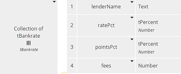 Each row of the table, type tBankrate, has components matching the table columns. Designating a type as tPercent simply reminds us that the number value represents a percent, not a decimal.