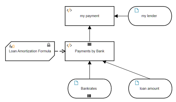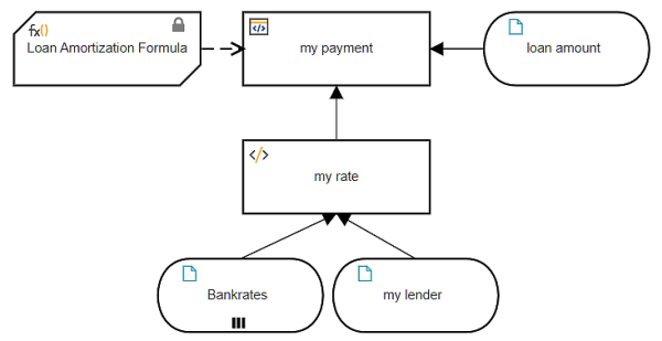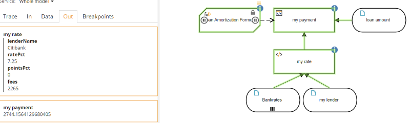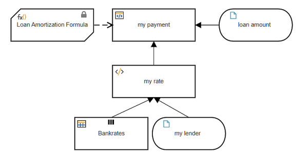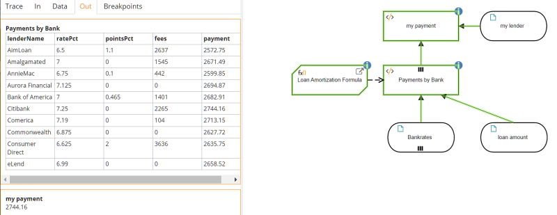 As an example, suppose we have a table of available 30-year fixed rate home mortgage products, differing in the interest rate, points (an addition to the requested amount as a way to "buy down" the interest rate), and fixed fees. You can find this data on the web, and the rates change daily. In our decision service, we want to allow users to find the current rate for a particular lender, and in addition find the monthly payment for that lender, which depends on the requested loan amount. Finding the lender's current rate is a basic lookup of unmodified external data. Finding the monthly payment using that lender requires additional calculation. Let's look at some different ways to model this.