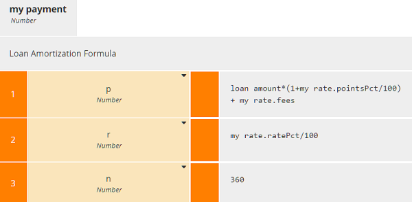 Decision my payment invokes this BKM using the lookup result my rate. Input data loan amount is just the borrower's requested amount, but the loan principal used in Loan Amortization Formula (parameter p) also includes the lender's points and fees. Since pointsPct and ratePct in our data table are expressed as percent, we need to divide by 100 to get their decimal value used in the BKM formula.