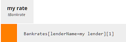 <table>[<Boolean expression of table columns>]in which the filter, enclosed in square brackets, contains a Boolean expression. Here the table is Bankrates and the Boolean expression is lenderName = my lender. In other words, select the row for which column lenderName matches the input data my lender.