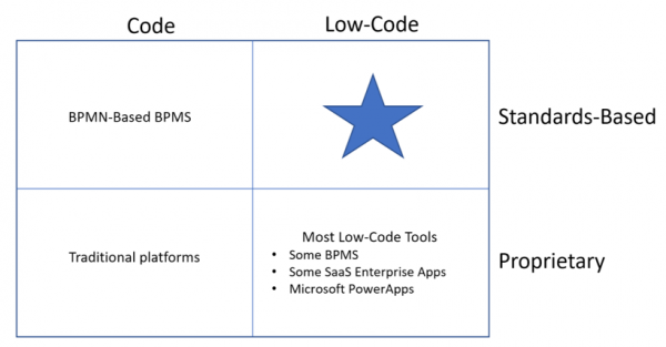 Trisotech's brilliant idea was to borrow boxed expressions and FEEL from DMN and use them in BPMN. Unlike other platforms, Trisotech offers a standards-based Low-Code approach to Business Automation, in particular applications of the third type, Straight-Through Processes. This suggests the view of the Business Automation landscape pictured below, with Trisotech in the sweet spot, Low-Code and Standards-Based.