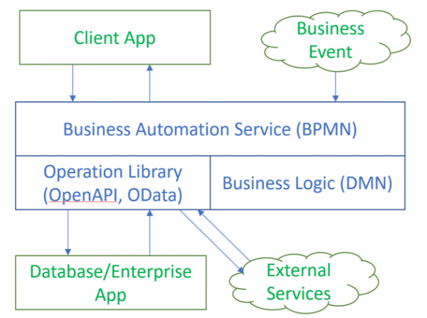The diagram below illustrates Trisotech's Low-Code Business Automation architecture. The Business Automation service as a whole is a BPMN straight-through process triggered by either a REST call from the external Client App or a Business Event. All of the business logic - not just what we normally think of as "decisions" - is created using DMN, invoked as needed by BPMN Decision tasks. Operations on databases and other systems of record are executed by BPMN Service tasks using Trisotech's Operation Library, a catalogue of REST interfaces configured simply by importing OpenAPI or OData files. APIs to third-party external services are configured and invoked the same way.The glue that binds all this together in a Low-Code way is the combination of FEEL and boxed expressions. These are used not only in the DMN business logic but in BPMN as well, mapping between process variables (FEEL) and the inputs and outputs of Service tasks, Decision tasks, and User tasks, as well as for gateway logic. Basically, if you know your way around DMN, you can create Business Automation services yourself.