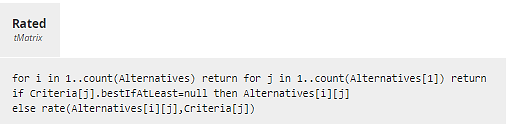 Decision Rated maps certain cells of Alternatives to a rating based on customer preference by calling the BKM rate. The mapped cells are those for Criteria with a non-null value in component bestIfAtLeast. The BKM rate compares the cell value to the values of components bestIfAtLeast, okIfAtLeast, and mustHaveAtLeast with the assumption that more is better. The logic of this BKM is not the best; it should be improved.Figure 10. Rated maps some raw Criteria values to rating based on user preference