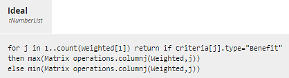 - The vector Ideal is a list of n values representing, for each column of Weighted, the max column value for Benefit types or the min column value for Cost types. The vector NonIdeal is a similar list, but using the min column value for Benefit types and the max value for Cost types. This DRD assumes the decision knows which Criteria are Benefits and which are Costs. Alternatively, you could encode that in the input data Criterion Weights and reference that in the decision logic.