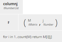 for i in 1..count(M) return M[i][j]Let’s take that apart. Here the range variable i is an integer from 1 to the number of rows in M. The expression M[i][j] means take the ith row of M and then the jth column of that row, iterating over i, i.e., over rows of M. So this also returns the jth column of M.