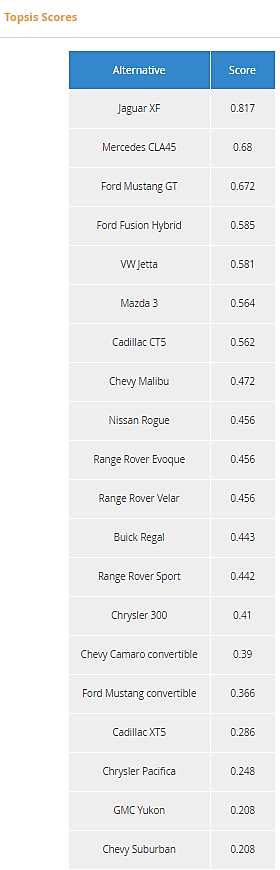 The model could certainly be improved by better separating purely subjective criteria like Style, from semi-objective criteria like Capacity and Luggage and purely objective criteria like Fuel Economy and Price. I think best if the purely objective ones are not input data at all but a zero-input decision and the semi-objective ones use a better mapping of the raw numeric values to a customer rating from 1 to 9. Also, it’s probably better to apply scaling only to the objective measures, since the others are already in a 1-9 range.Readers are invited to make those improvements and send them to me. We will post the good ones on the site.