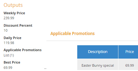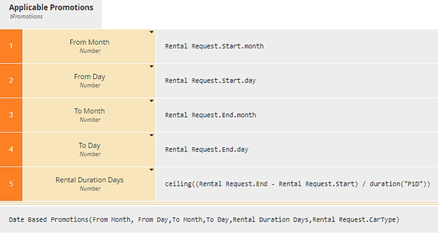 Applicable Promotions calls this BKM by supplying values to the 6 parameters. It is modeled as a context. The first 4 context entries use FEEL calendar type components to extract the month and day value from the rental start and end date-times. The fifth calculates the number of days in the rental. Those context entries are used in the call to the BKM in the final result expression.