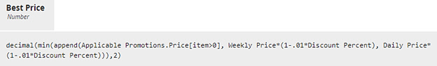 So Applicable Promotions.Price is the Price column of the table, a list of numbers, and the filter [item>0] here just ensures that if there are no Applicable Promotions the expression is an empty list rather than null. Reading the literal expression from the inside out, we append to the list of prices from Applicable Promotions the discounted Weekly Price and the discounted Daily Price. Then we take the minimum value of the resulting list and round it to two decimal digits following the decimal point. This style of nesting one function inside another is economical but maybe hard for beginners to understand. Alternatively, you could have separate decisions in your DRD for each part of it – the list append, finding the minimum, and rounding – or you could use another value expression type called a context to do each of those steps in a separate table entry.