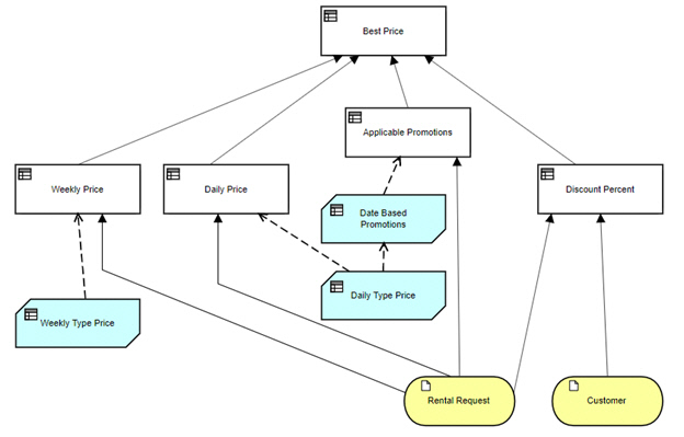 Want to learn DMN decision modeling without training? DMN Method and Style, 2nd edition is a good place to start. But to really learn it, you need to go beyond books. You need to get your hands dirty in a tool. I suggest starting with a free trial of Trisotech DMN Modeler.When you log in, go to the EU-Rent repository (File/Open/EU-Rent) and open the model called EU-Rent Pricing. I’ll walk you through it here. Then click File/New and try to re-create the model yourself. That might sound like busywork but, trust me, you’ll learn a lot just doing that.